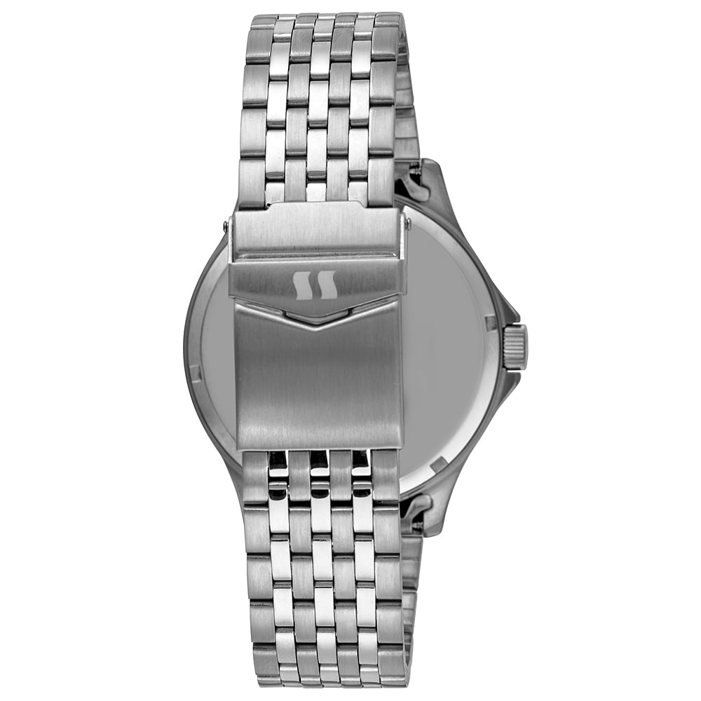 A resistência à água de 5 ATM assegura a durabilidade e o uso em diversas situações do dia a dia. O fundo do relógio é do tipo Rosca, proporcionando maior vedação e segurança ao mecanismo interno.