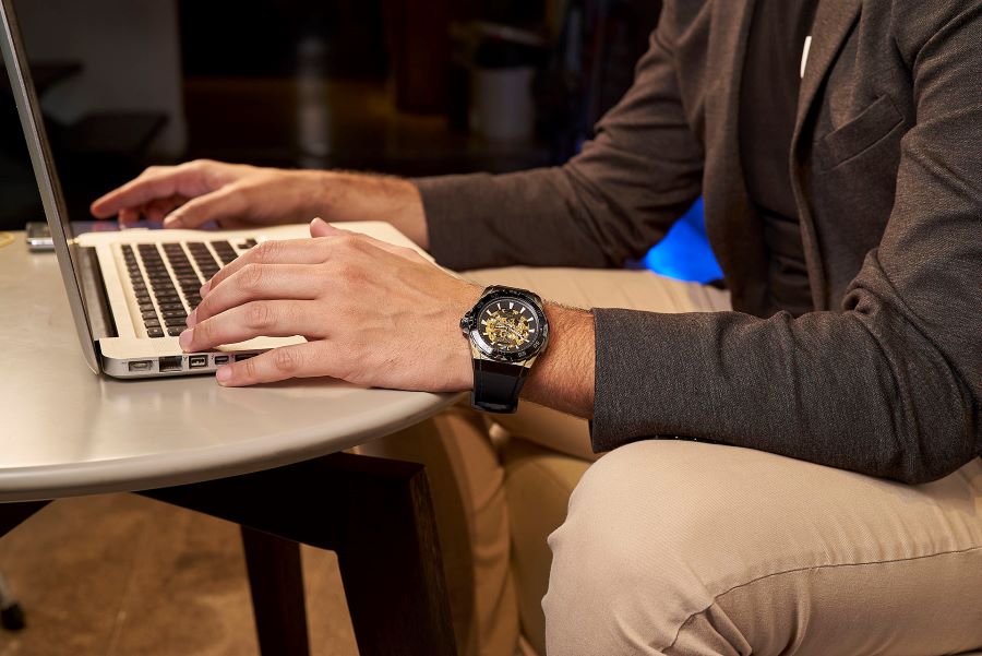 Com design diferenciado, este relógio tem como destaque seu mostrador transparente com todo o mecanismo à mostra. É um relógio com movimento automático, possui caixa de aço e o visual preto destaca o mecanismo dourado. Sua pulseira é feita de silicone, oferecendo um caimento confortável ao pulso. Esse relógio possui a caixa em 4,5 cm de tamanho.