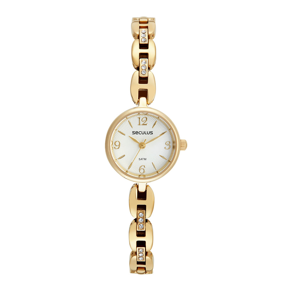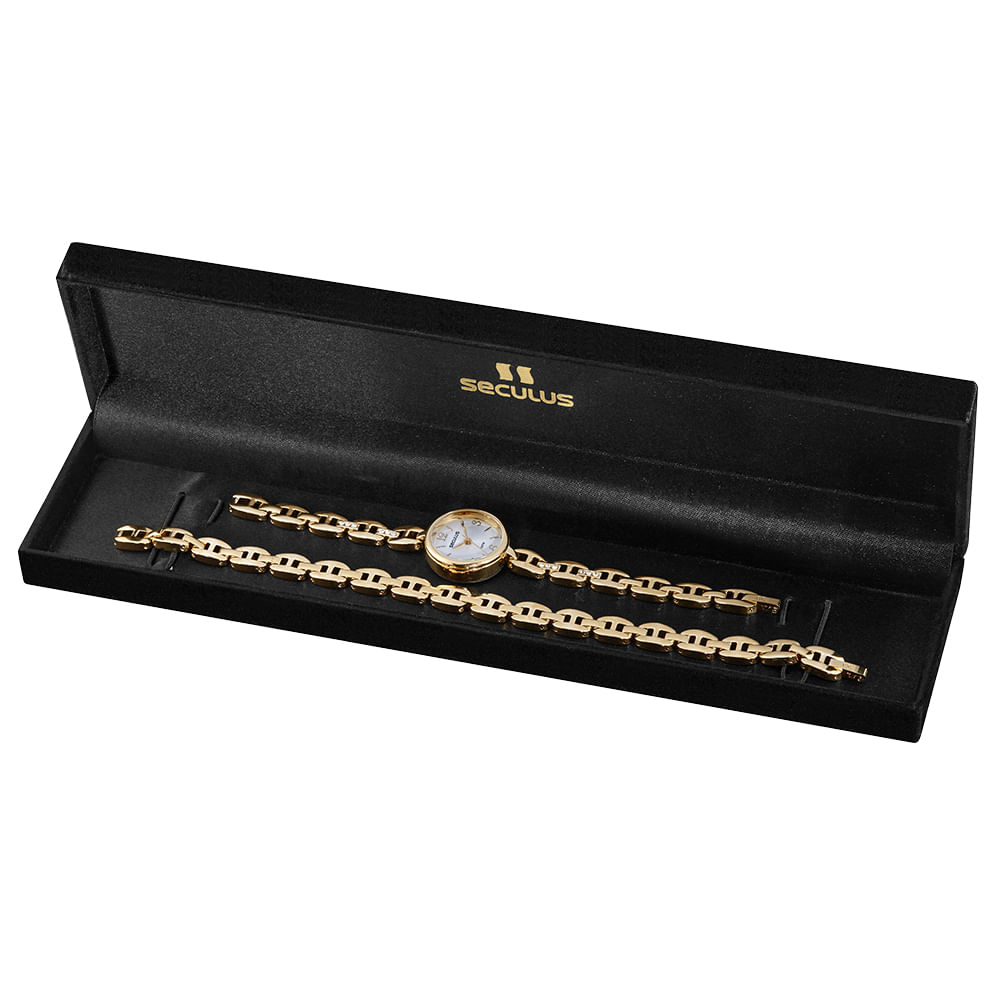 Perfeito para serem combinados, este conjunto é verdadeiramente impecável! O relógio analógico destaca-se como uma peça clássica, exibindo uma refinada folheação dourada, uma caixa em metal de dimensões delicadas e uma pulseira fina com um elegante fecho estilo joalheria. Como complemento perfeito, uma pulseira no estilo bracelete de corrente, incrivelmente charmosa, harmoniza-se de maneira encantadora com o design do relógio. Juntos, esses acessórios formam uma dupla elegante e sofisticada, garantindo um visual impecável em qualquer ocasião. Vale ressaltar que o relógio possui uma caixa com 2,3 cm de tamanho, conferindo-lhe uma presença discreta e refinada.