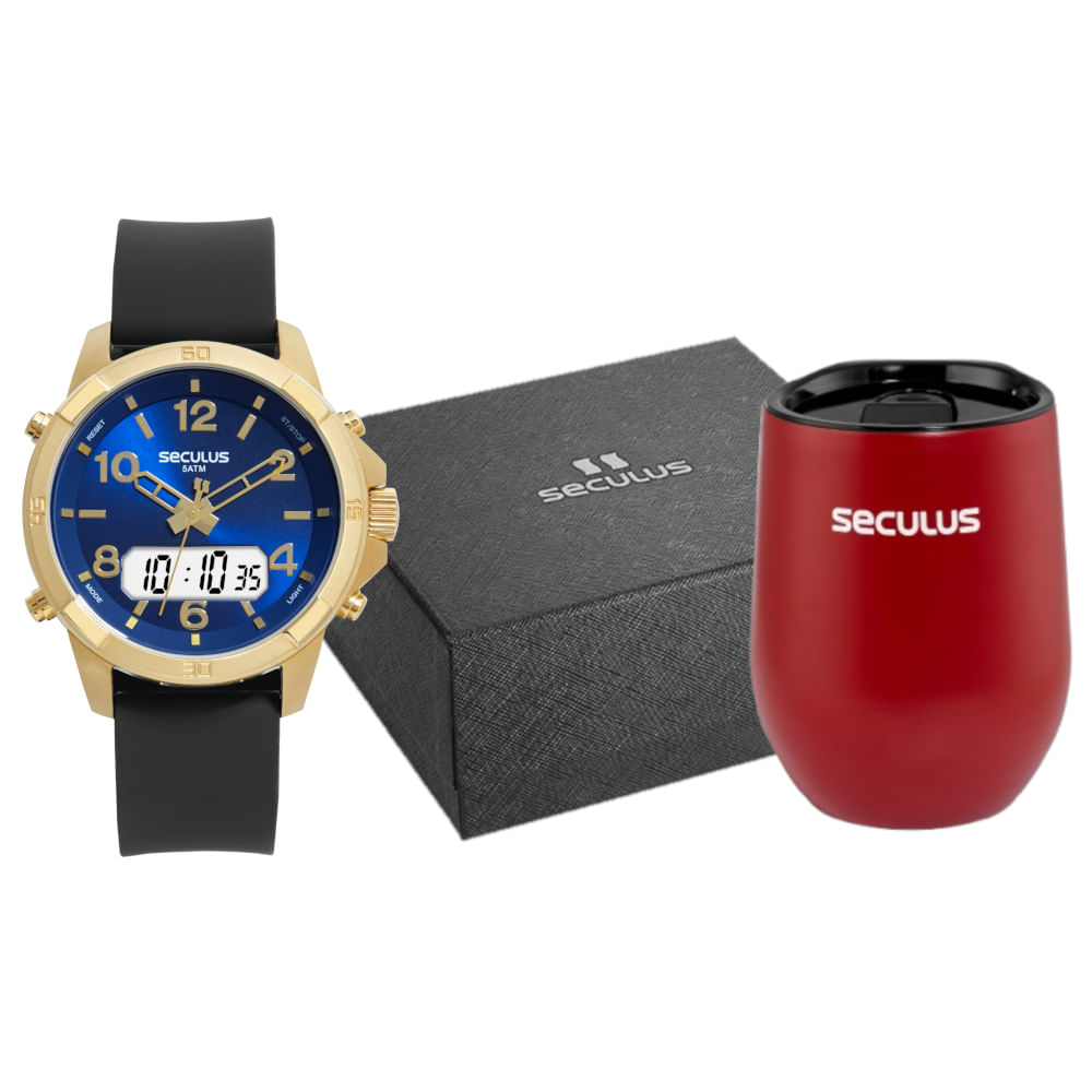 Este Kit Masculino tem como peça principal um relógio com função Ana-Digi, combinando o melhor da tecnologia digital e do estilo analógico. A caixa redonda é feita em Aço, apresentando um visual robusto e de qualidade. O mostrador Azul vibrante facilita a leitura e confere personalidade.