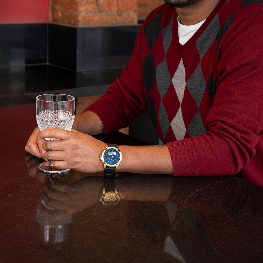É um acessório perfeito para o homem dinâmico que busca versatilidade, alternando entre a praticidade do digital e a leitura tradicional. A combinação do metal com a pulseira de silicone azul cria uma peça marcante para looks casuais e esportivos.