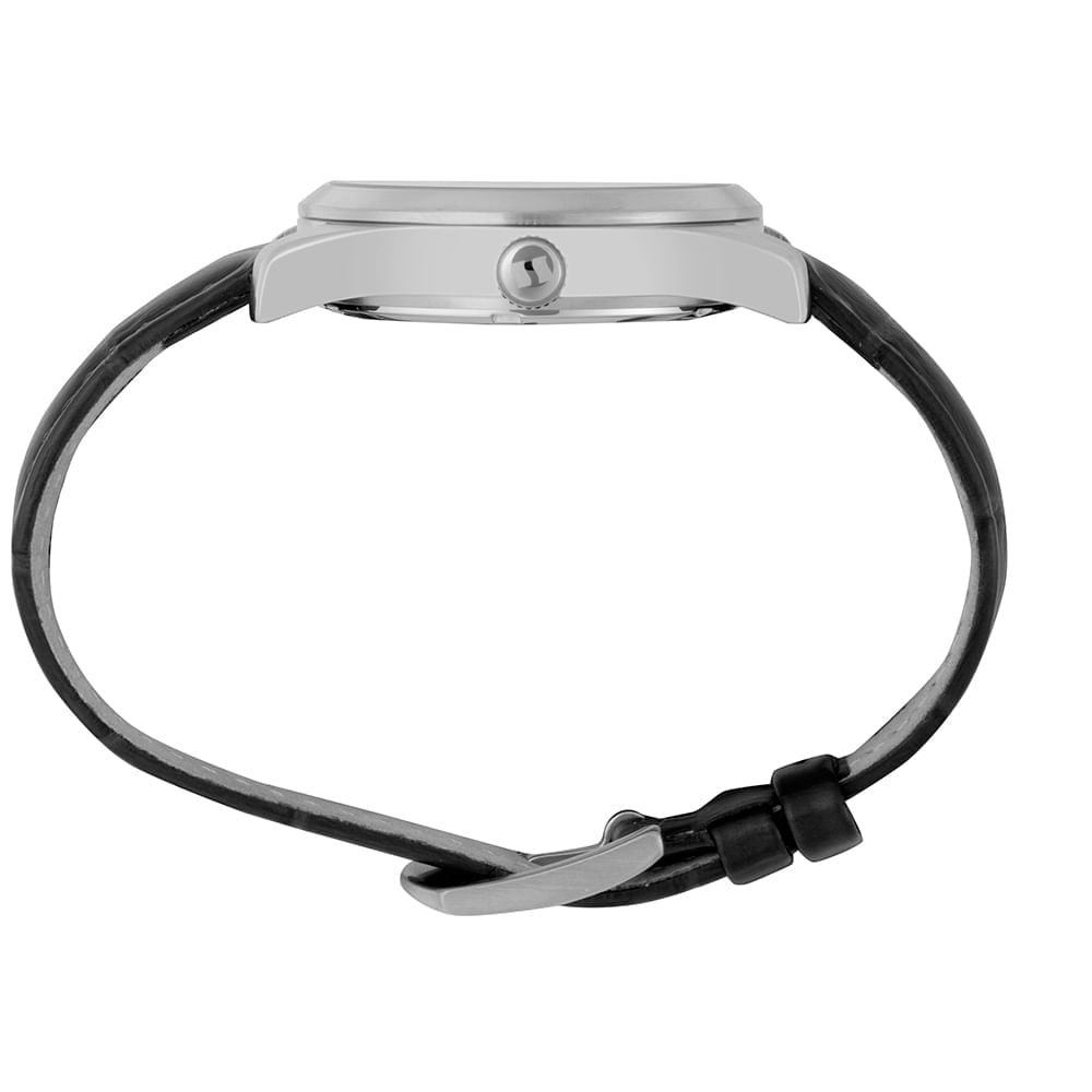 Este modelo combina a caixa em aço prateado de 38mm com uma pulseira em couro genuíno preto com textura croco. O mostrador com efeito sunset adiciona profundidade ao visual, criando um contraste elegante com a pulseira.
