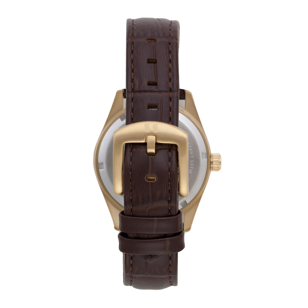 A combinação da caixa em aço dourado de 38mm com a pulseira em couro genuíno marrom texturizado croco define este modelo. O mostrador com efeito sunset harmoniza perfeitamente com os tons quentes da peça.
