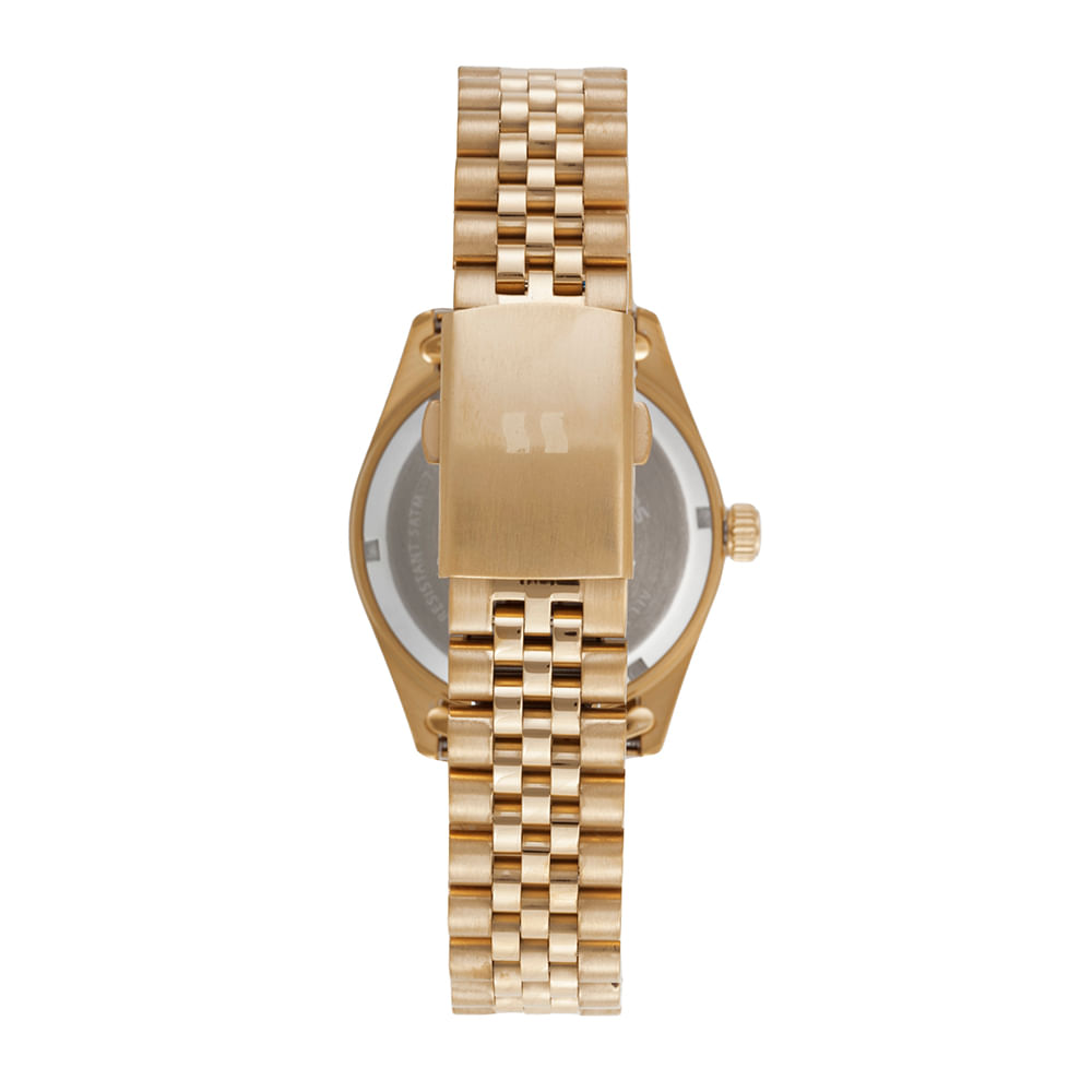 Este modelo destaca-se pelo seu acabamento integral em aço dourado e pelo mostrador trabalhado com efeito sunset. A pulseira Jubilee e a caixa de 38mm formam um conjunto clássico e bem estruturado.