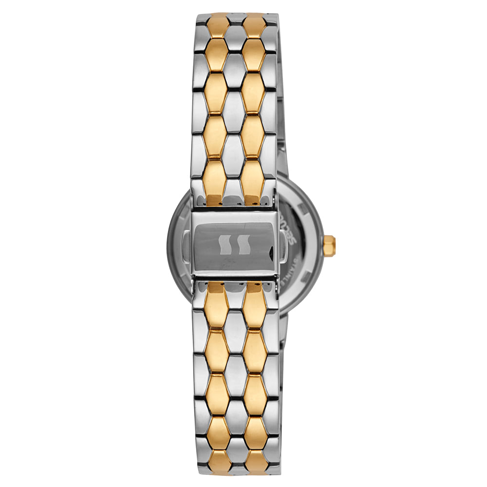 A pulseira sólida em aço possui um design diferenciado que mescla os tons de prata e rosé, adicionando um toque de modernidade e sofisticação. O fecho por acionamento lateral é prático e seguro para o uso diário. O mecanismo analógico é protegido por um fundo do tipo rosca, e o relógio conta com resistência à água de 5 ATM.