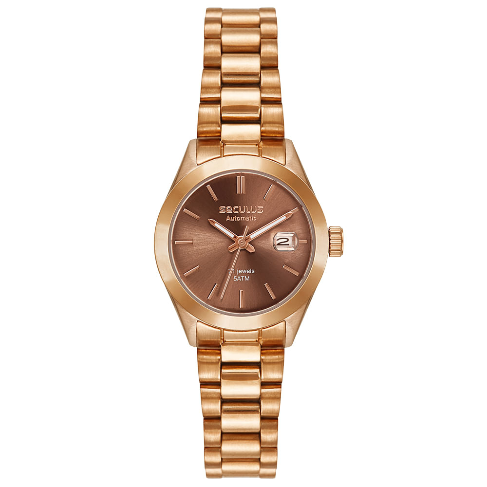 Uma escolha de extrema elegância para mulheres que buscam um acessório diferenciado. O mostrador marrom confere um toque quente e exclusivo. Um relógio que une a precisão do mecanismo automático a um visual deslumbrante.