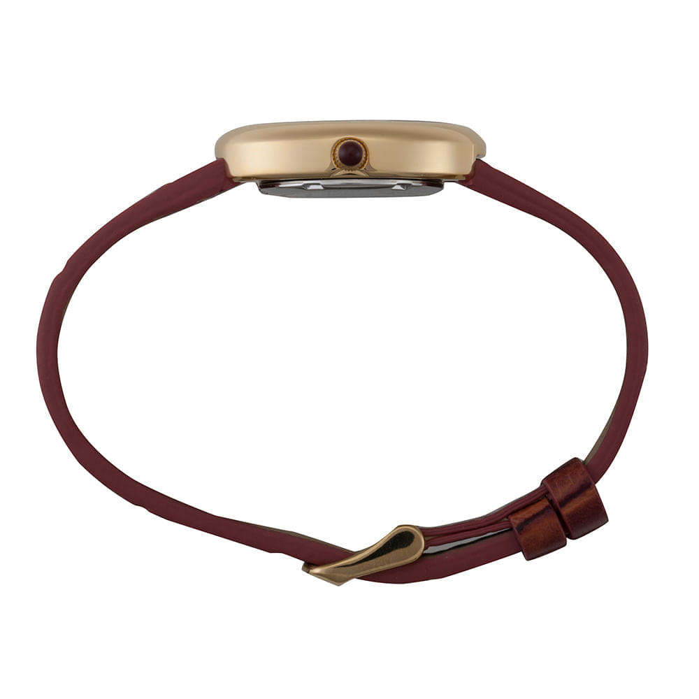 A pulseira em couro sintético oferece um ajuste confortável e complementa o visual vintage. O fecho de fivela é simples e eficaz para o uso cotidiano. A função analógica mantém o design limpo e focado na elegância.