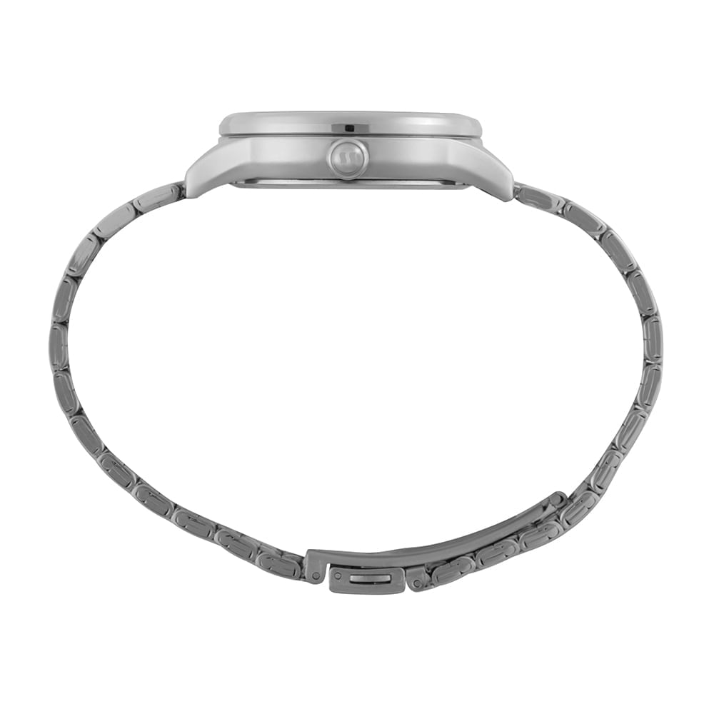 A pulseira de aço prateada possui um fecho do tipo joalheria, que integra o design da peça com segurança e elegância. Sua estrutura foi desenvolvida para oferecer um ajuste confortável, mantendo o estilo limpo e minimalista proposto pelo modelo. O fundo da caixa é do tipo pressão, garantindo a vedação adequada para os componentes eletrônicos.