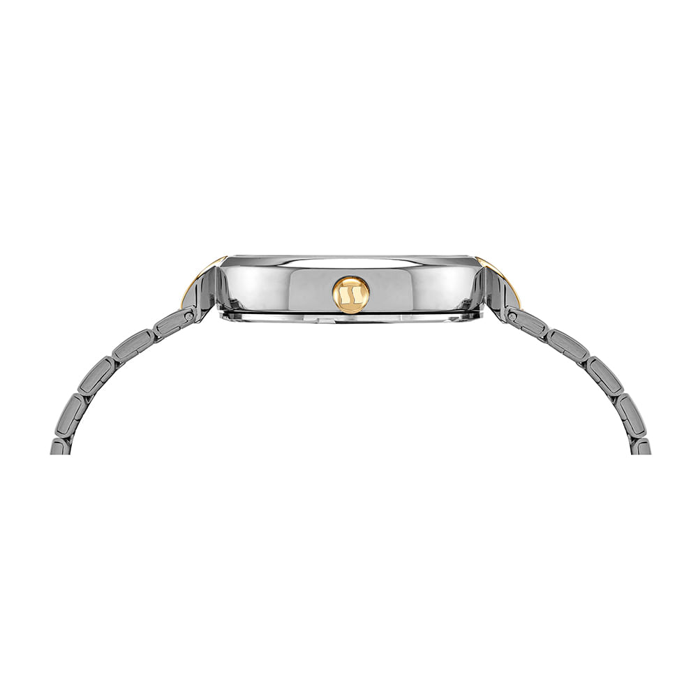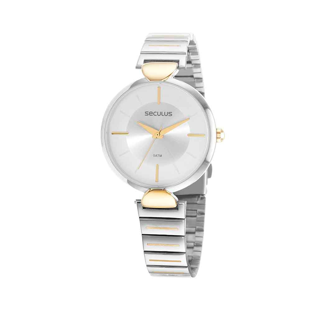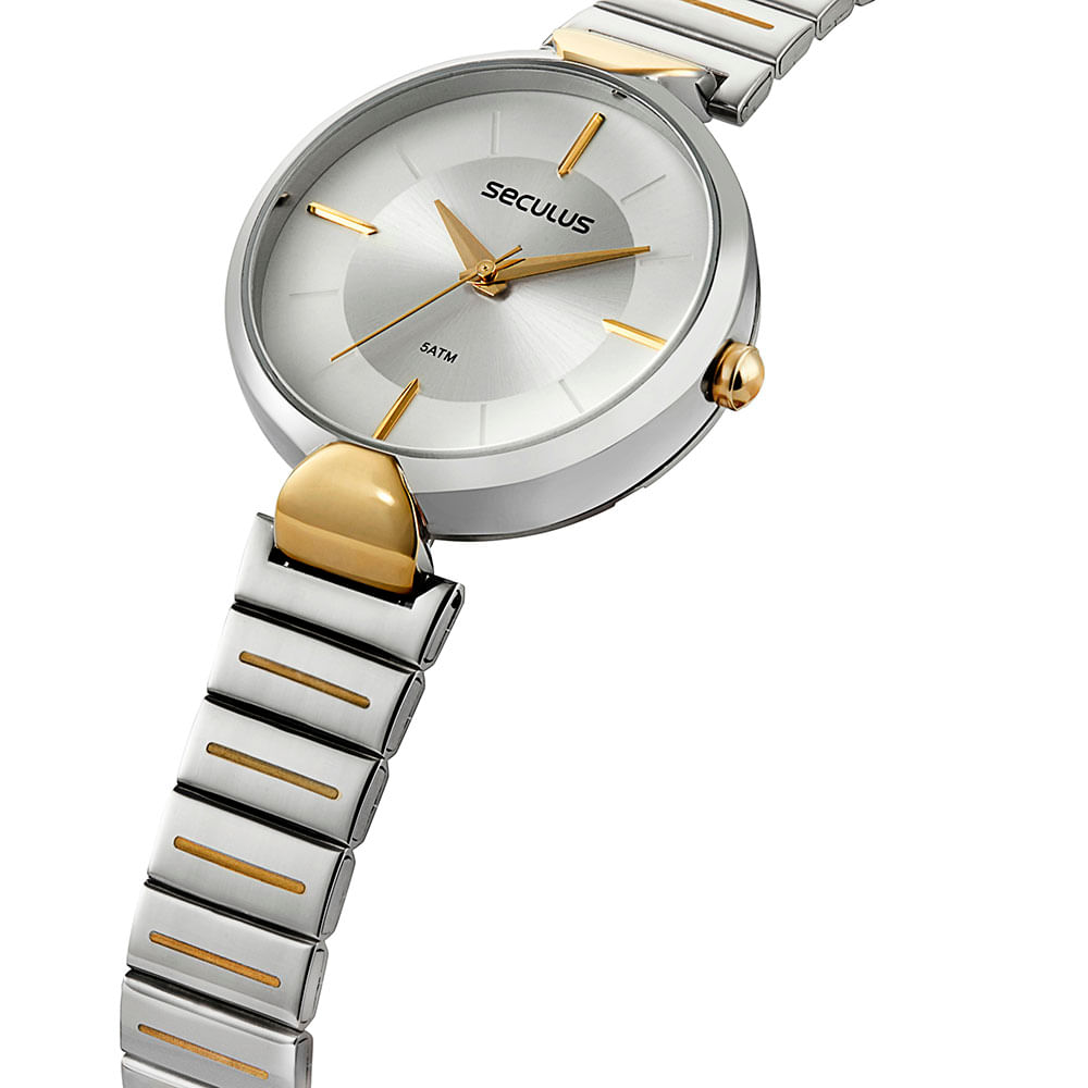Pulseira em aço com detalhe nos elos. Terminal da caixa com design diferenciado. Este relógio contém visor prata e caixa de metal especial cromado com função analógico. A pulseira trabalhada em aço prata e dourado, possui fecho por acionamento lateral. Esse relógio possui a caixa em 3,6 cm de tamanho.