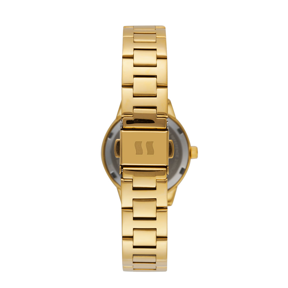 A pulseira é confeccionada em aço dourado e possui fechamento por meio de uma fivela ajustável. O relógio oferece resistência à água de 5 ATM, protegendo a estrutura contra imersões leves e respingos. O fundo da caixa é do tipo rosqueado, assegurando uma vedação firme e segura para os componentes internos.