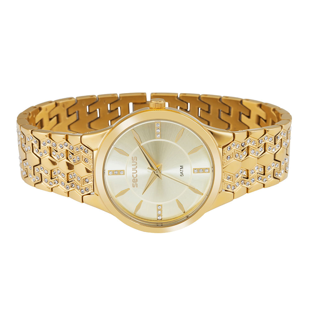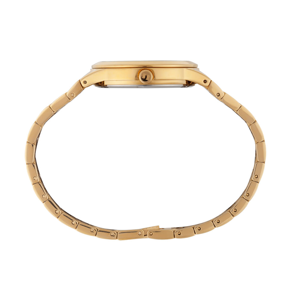 Sua pulseira em aço dourado conta com um fecho estilo joalheria, garantindo um ajuste seguro e um acabamento elegante. A resistência à água é de 5 ATM, o que permite o uso seguro em situações cotidianas de exposição a líquidos. O fundo rosqueado da caixa oferece proteção adicional, assegurando a integridade dos componentes analógicos internos.