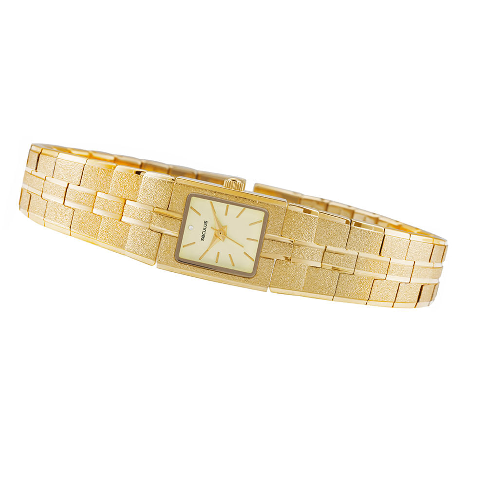 Este modelo feminino conta com uma caixa quadrada de metal especial dourado com apenas 16mm de diâmetro. O mostrador em tom champagne apresenta índices completos, permitindo uma visualização clara das horas no sistema analógico. O tamanho extra-pequeno da caixa confere uma delicadeza extrema ao acessório, ideal para ocasiões sociais.