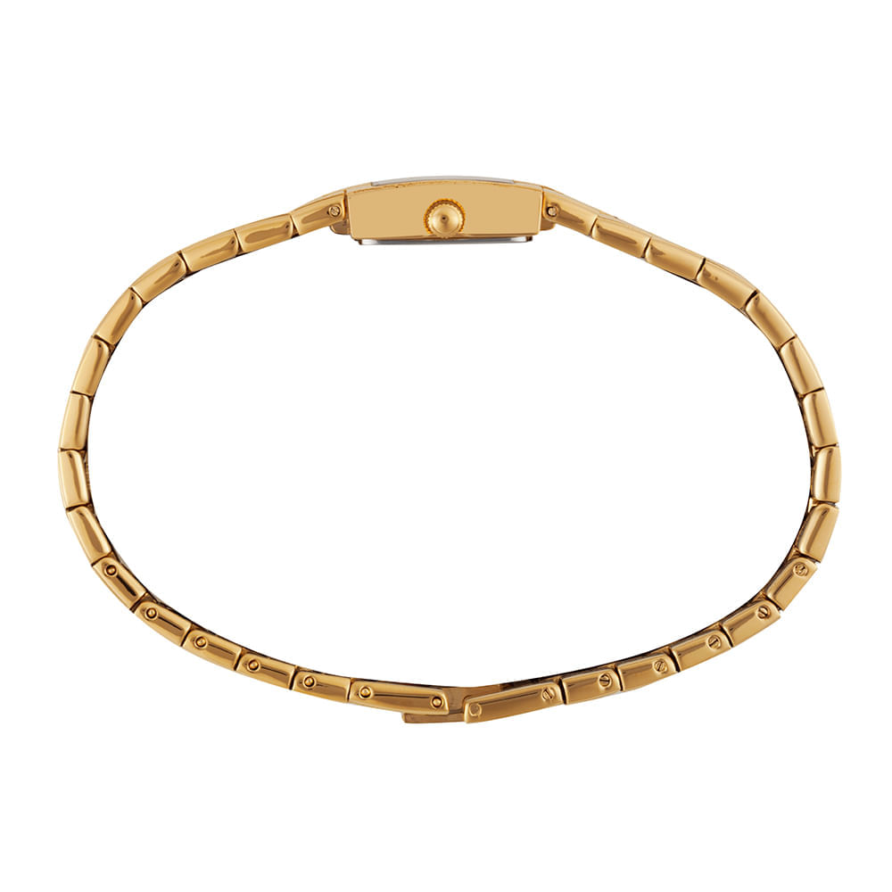 A pulseira dourada é feita de metal especial e utiliza um fecho do tipo joalheria para um acabamento sem emendas. Com resistência à água de 3 ATM, a peça está protegida contra contatos leves com líquidos durante o cotidiano. O fundo da caixa é do tipo pressão, mantendo o mecanismo interno seguro contra a entrada de poeira e umidade.