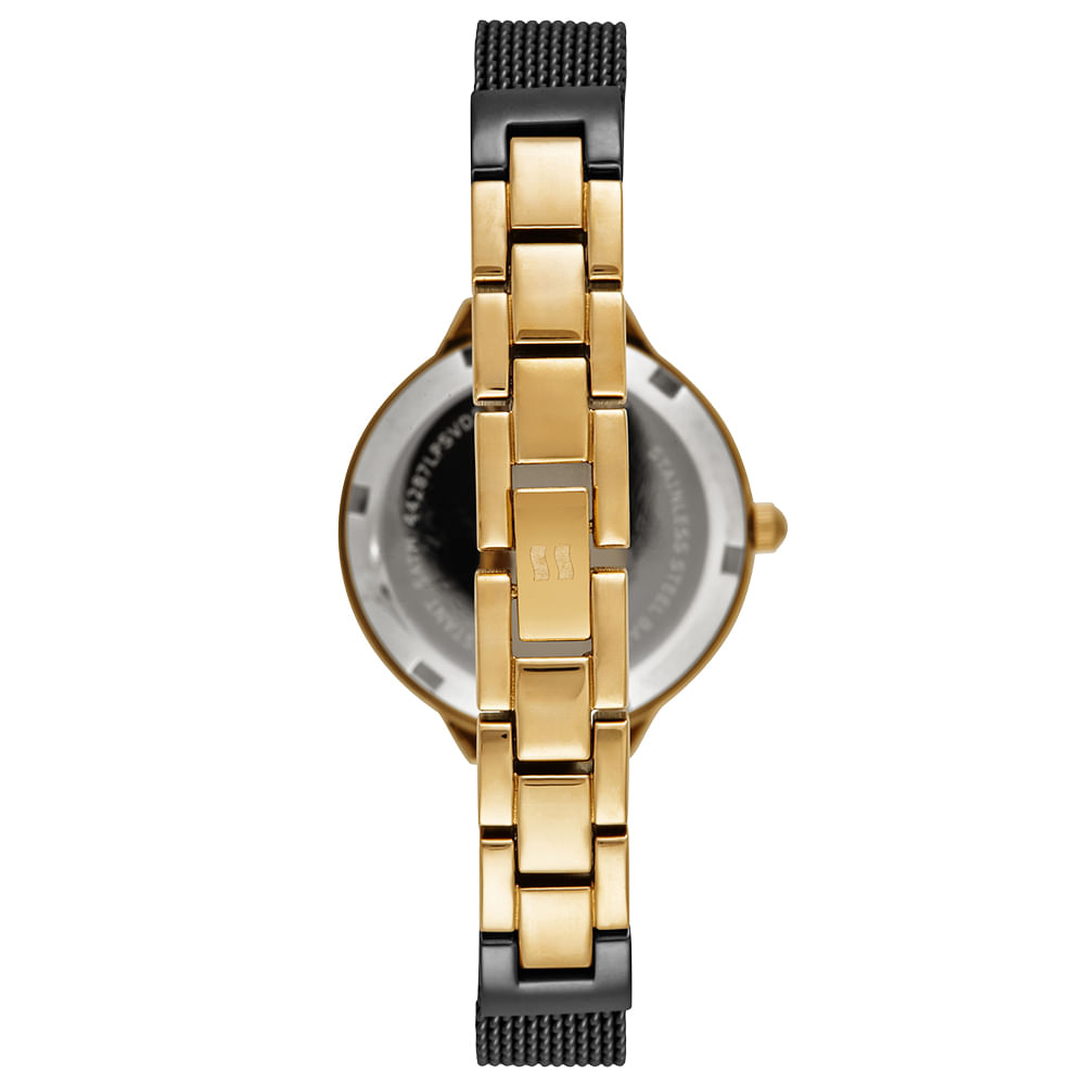 Com uma estética "all black" poderosa e sofisticada, esse Relógio é a definição de elegância moderna. Sua estrutura com acabamento preto destaca o brilho intenso dos cristais aplicados no terminal e na bisel da caixa. O dial minimalista surpreende com uma aplicação em madre pérola negra, que exibe reflexos sutis e um visual misterioso. A pulseira, que mescla a flexibilidade da malha de aço com uma parte regular e fecho joalheria, confere um design único e confortável. Resistente à água 5 ATM, é o relógio ideal para a mulher que busca um acessório com forte declaração de estilo, combinando o brilho dos cristais com a sobriedade do preto.
