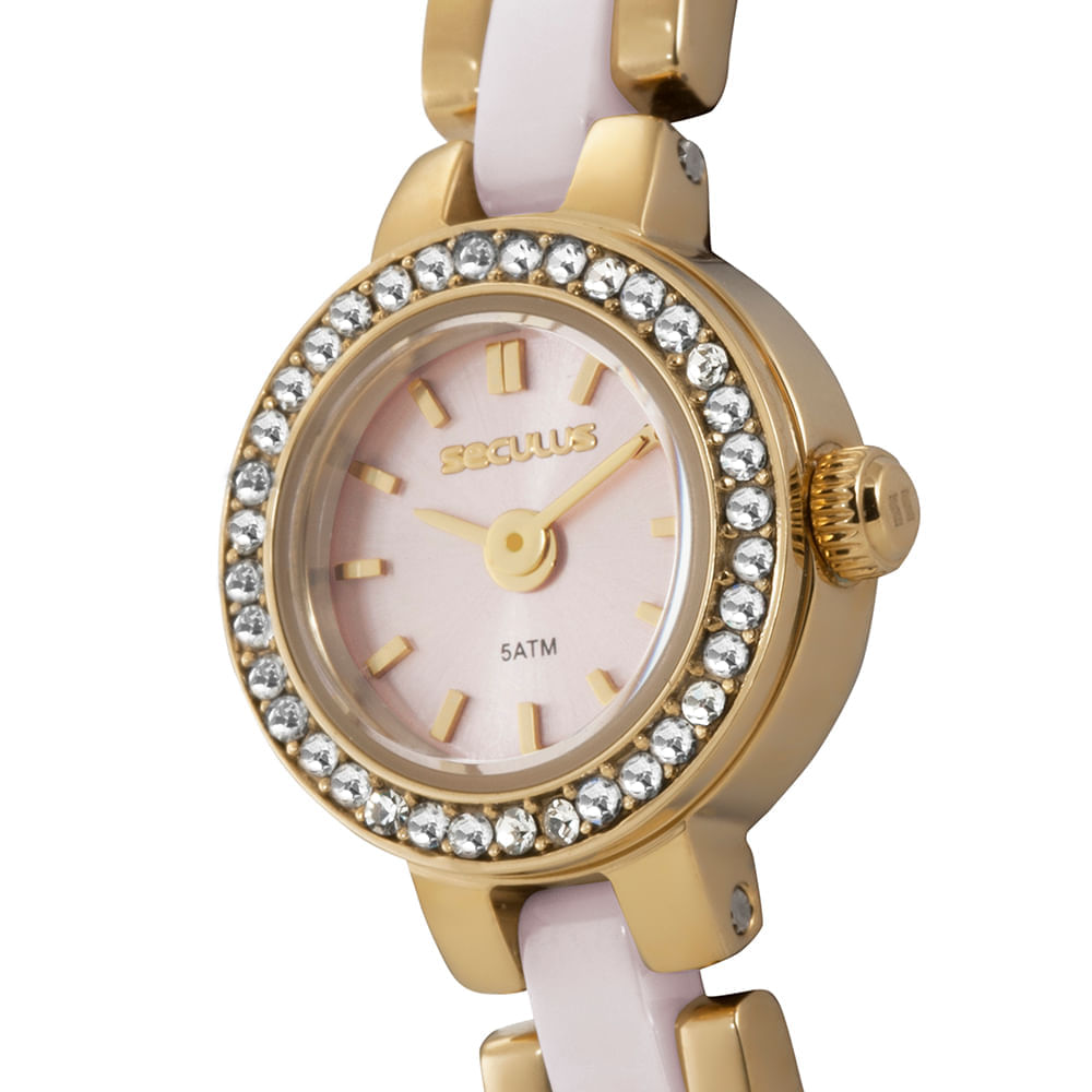 O Relógio Feminino Analógico Mini Bisel Cerâmica é uma peça compacta com caixa de apenas 15 mm. O design dourado é enriquecido por um bisel com aplicações de cristais, que adicionam um brilho refinado ao acessório. O mostrador possui índices completos para marcação das horas, garantindo funcionalidade em uma estrutura reduzida.