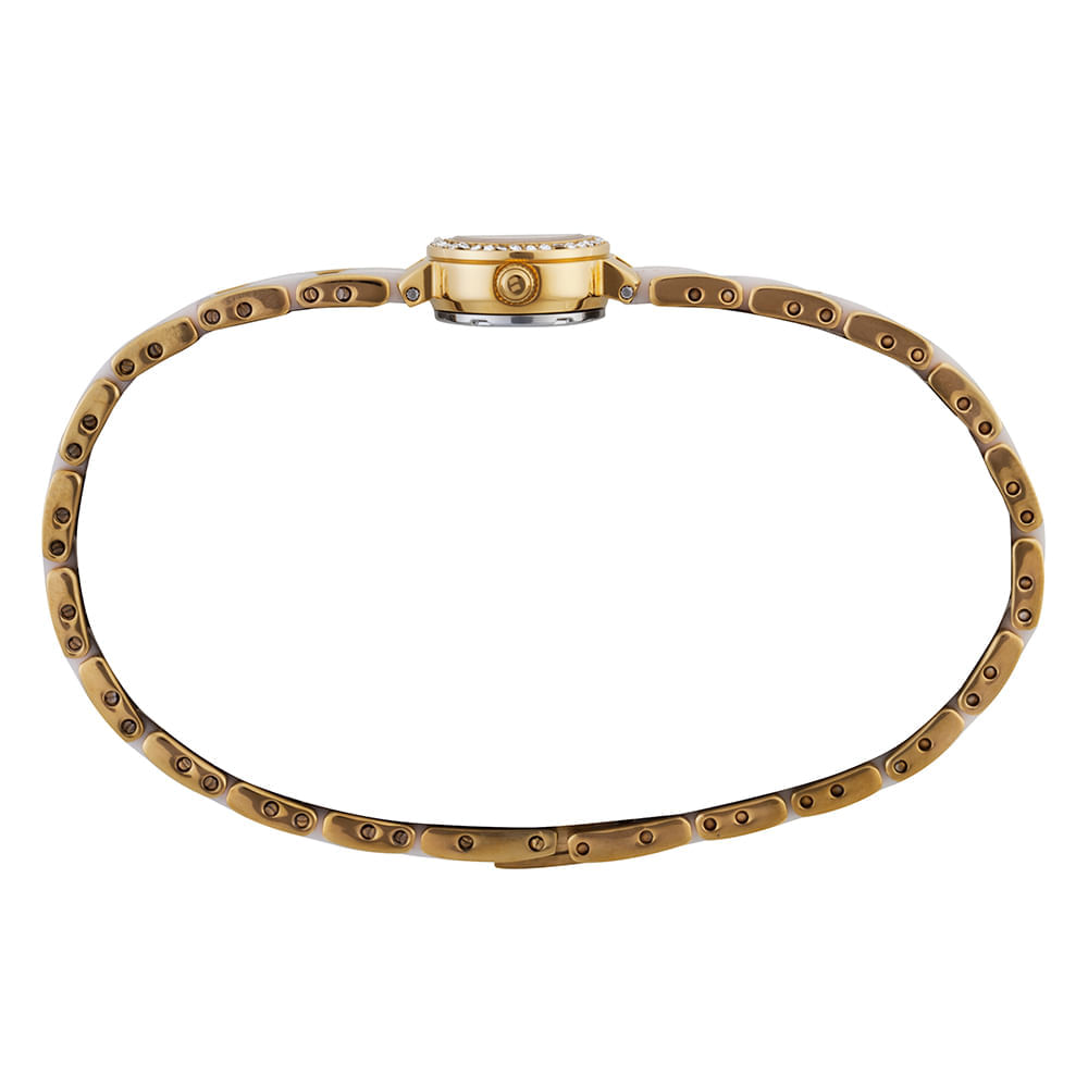 O grande diferencial deste modelo é sua pulseira com elos sólidos de cerâmica, material conhecido por sua resistência e durabilidade. A combinação da cerâmica com o metal dourado cria uma estética luxuosa e diferenciada no pulso. A caixa possui fundo rosqueado, oferecendo uma vedação superior para o mecanismo analógico interno.