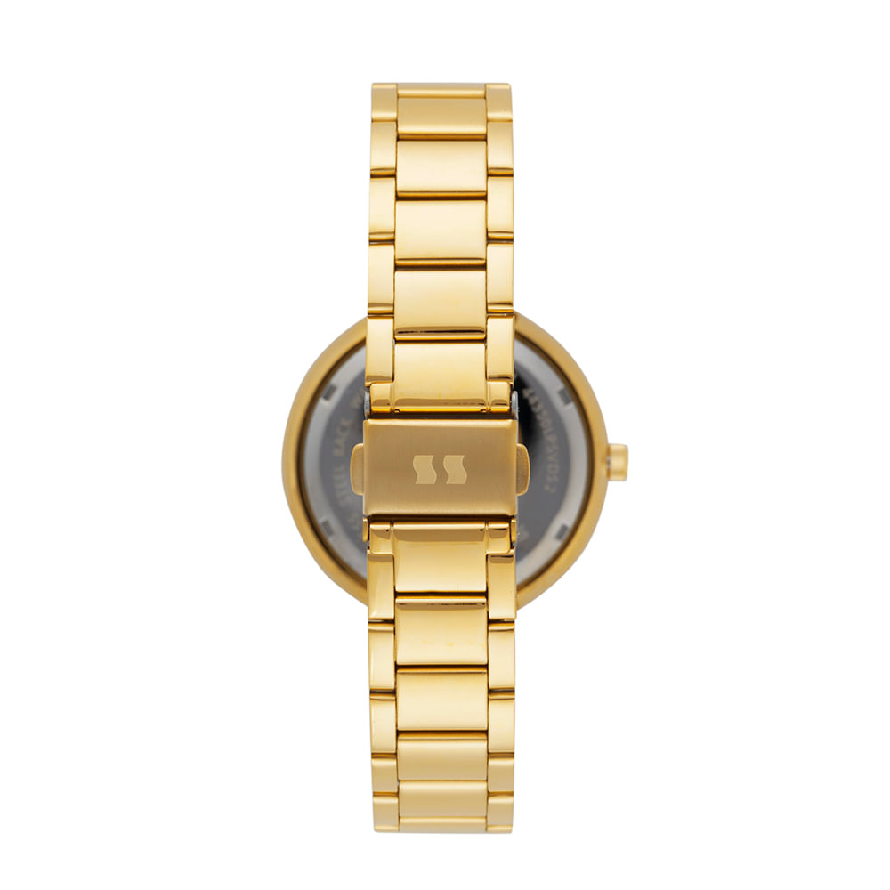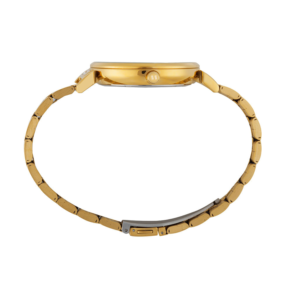 A pulseira é produzida em aço dourado e utiliza um sistema de fecho por acionamento lateral. A peça oferece resistência à água de 5 ATM, sendo protegida contra imersões leves e respingos do uso diário comum. O fundo rosqueado da caixa contribui para a vedação eficiente, preservando o mecanismo interno contra danos externos.