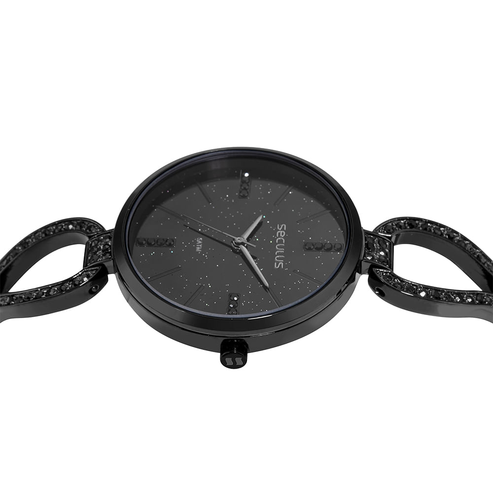 Este Relógio Feminino Analógico é uma peça de design marcante, que une o brilho dos cristais a um acabamento escuro e sofisticado. Seu mostrador preto de 29 mm de diâmetro apresenta um cativante efeito "moon stone" e marcações com cristais, criando um contraste luminoso e elegante. A leitura das horas é feita através de indexes completos.