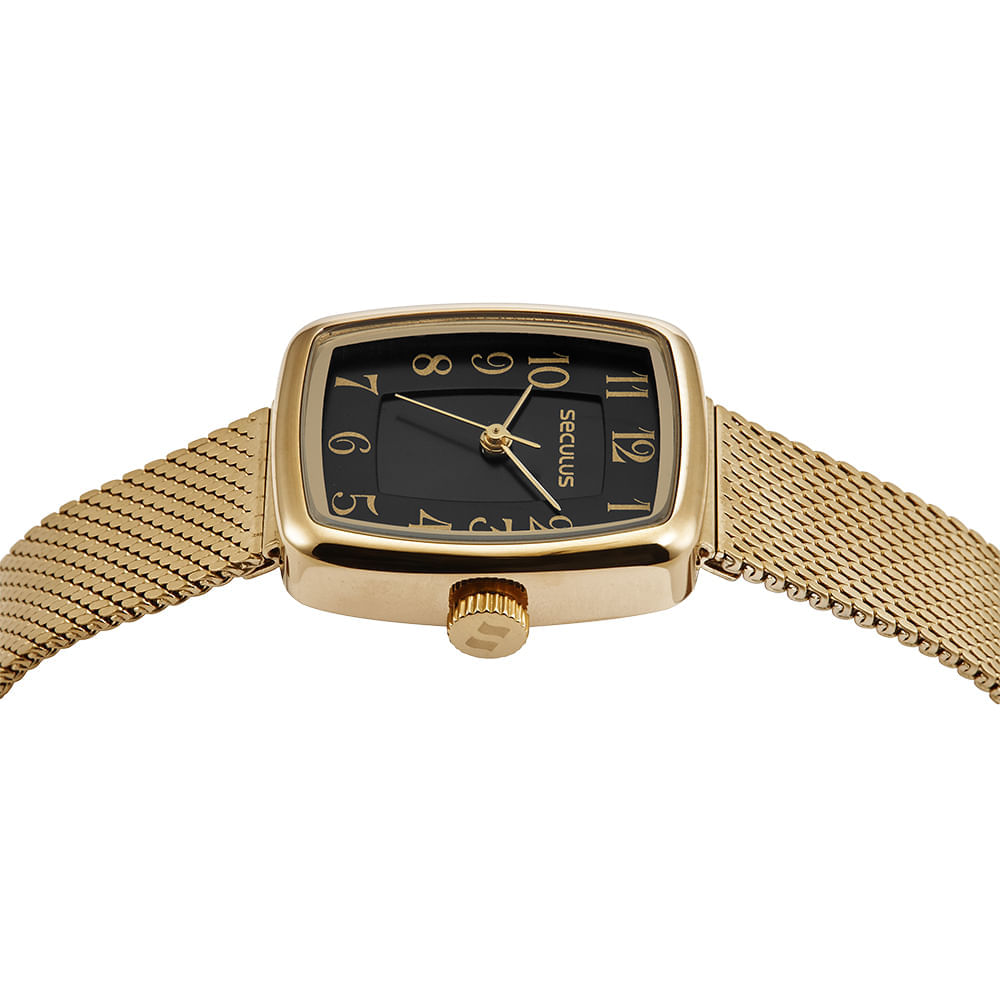Sua pulseira é produzida em malha de aço com acabamento dourado, garantindo durabilidade e um toque suave na pele. O sistema de fecho tipo carrinho facilita a regulagem da peça, adaptando-se com segurança a diferentes tamanhos de pulso. O funcionamento analógico é complementado por um fundo de pressão que veda o mecanismo.
