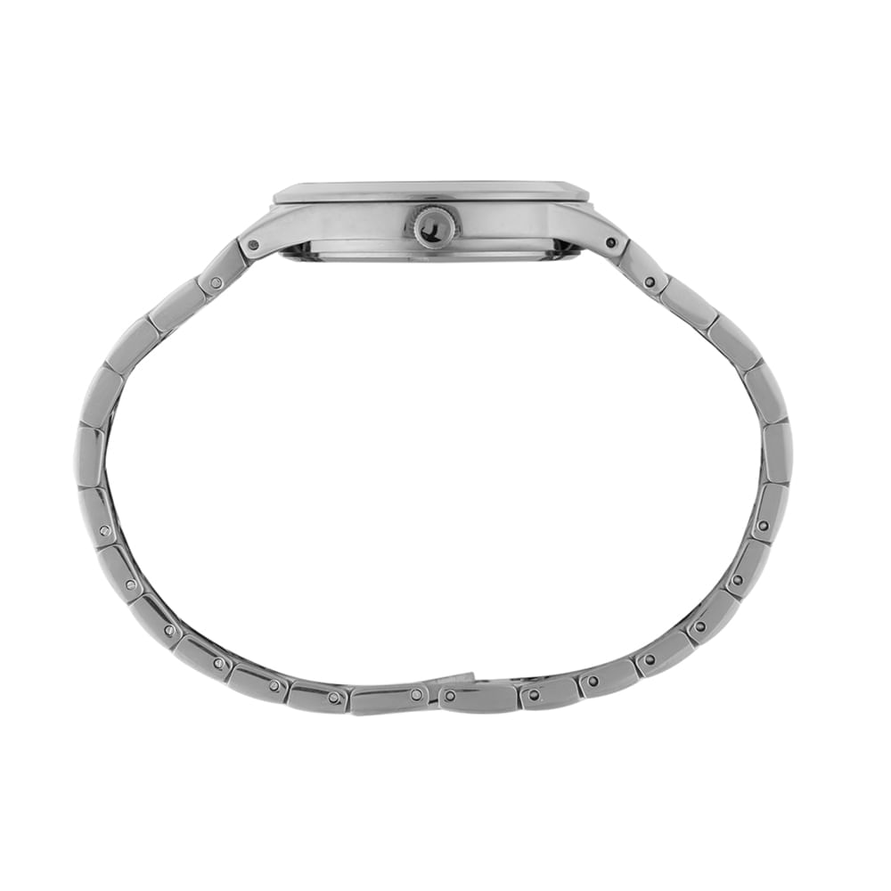 Este relógio feminino apresenta uma caixa redonda de metal especial prateado com 36mm de diâmetro. O mostrador prata possui índices incompletos, reforçando uma estética limpa e moderna para o sistema analógico. O tamanho médio da caixa garante uma boa visibilidade das horas e uma presença equilibrada no pulso da usuária.