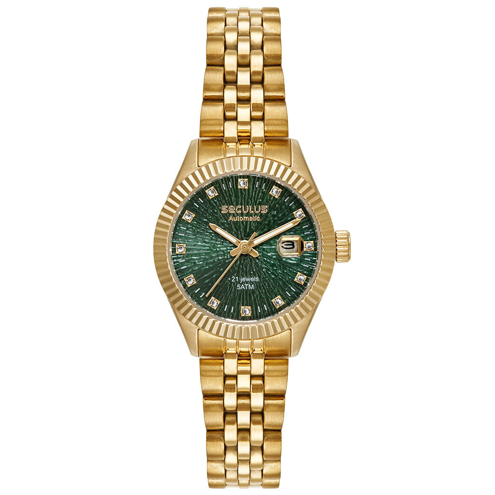 O destaque é o mostrador verde intenso, com marcadores index discretos e ponteiros dourados, garantindo excelente leitura e impacto estético.
