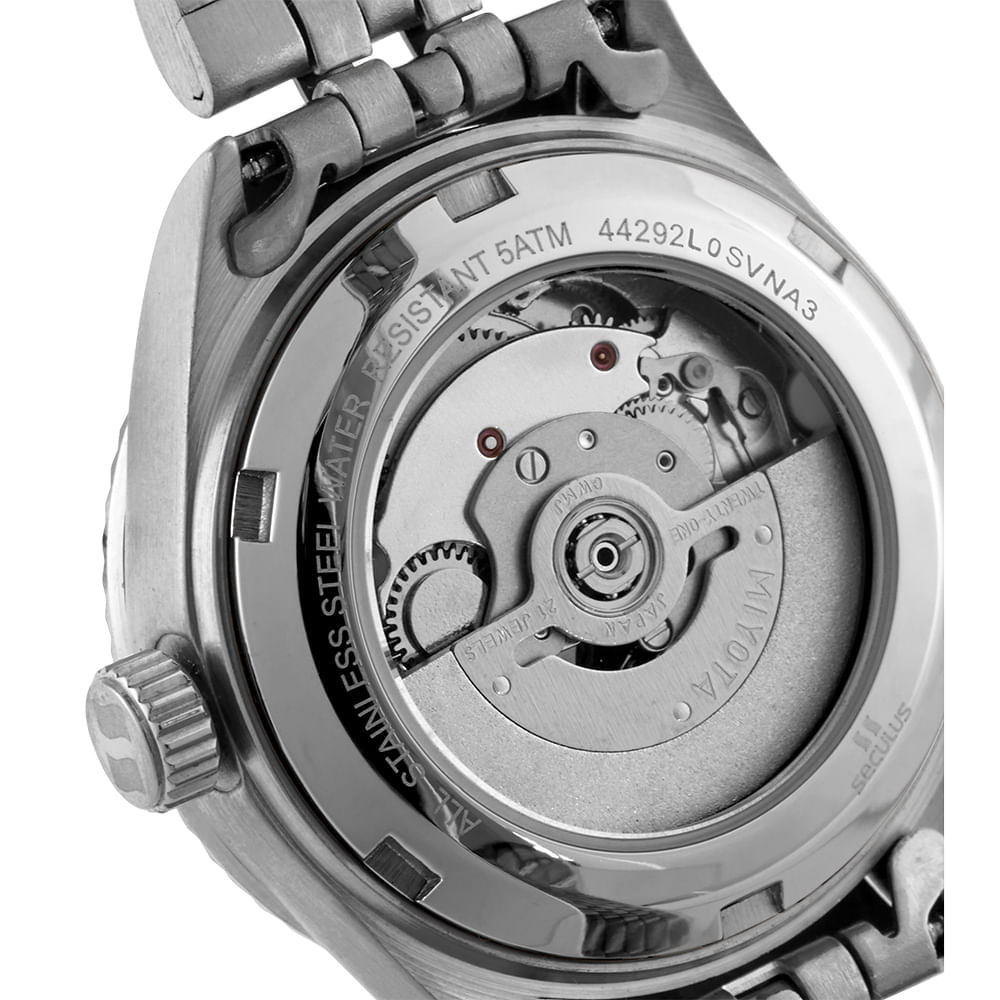 Construído, 100% em aço inoxidável, o modelo abriga o confiável movimento japonês Miyota, um calibre de 6TI5 com enrolamento automático e manual, oferecendo reserva de marcha de até 40 horas.