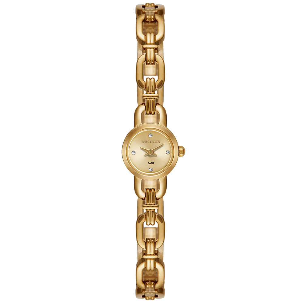 Este modelo feminino Seculus encanta com sua caixa mini de 15mm e um reluzente banho dourado. As marcações em cristais no mostrador elevam o nível do design, proporcionando uma leitura das horas cheia de charme. É uma peça compacta que valoriza o pulso feminino com sutileza.