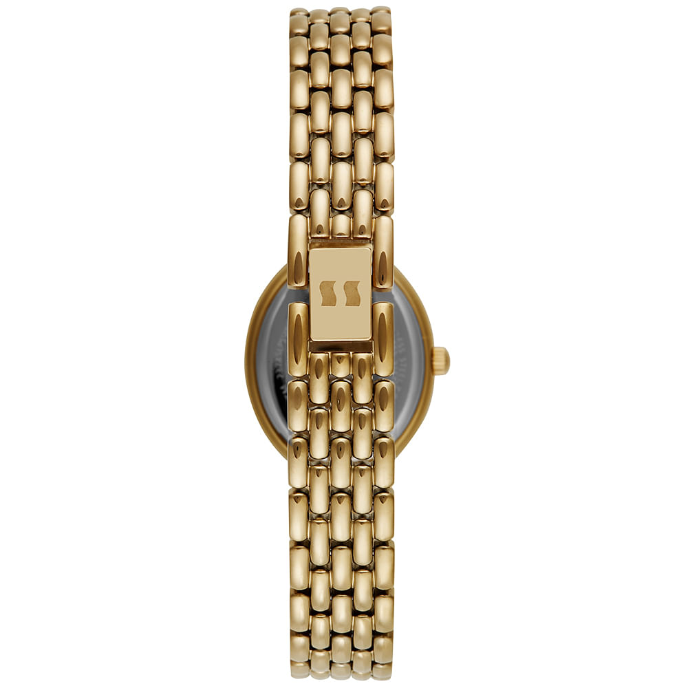 Desenhado como uma verdadeira joia, esse relógio é a personificação da delicadeza e do luxo. Seu maior destaque é a caixa oval com um elegante banho dourado, que tem seu brilho intensificado pelos cristais cravejados na bisel, capturando a luz a cada movimento. O mostrador minimalista complementa a riqueza dos detalhes externos. A pulseira em aço sólido possui um design diferenciado de elos que se assemelha a uma pulseira de luxo, finalizada com um prático e seguro fecho joalheria. Com resistência à água de 5 ATM, este relógio é o acessório perfeito para a mulher que busca uma peça sofisticada e cheia de glamour para ocasiões especiais.