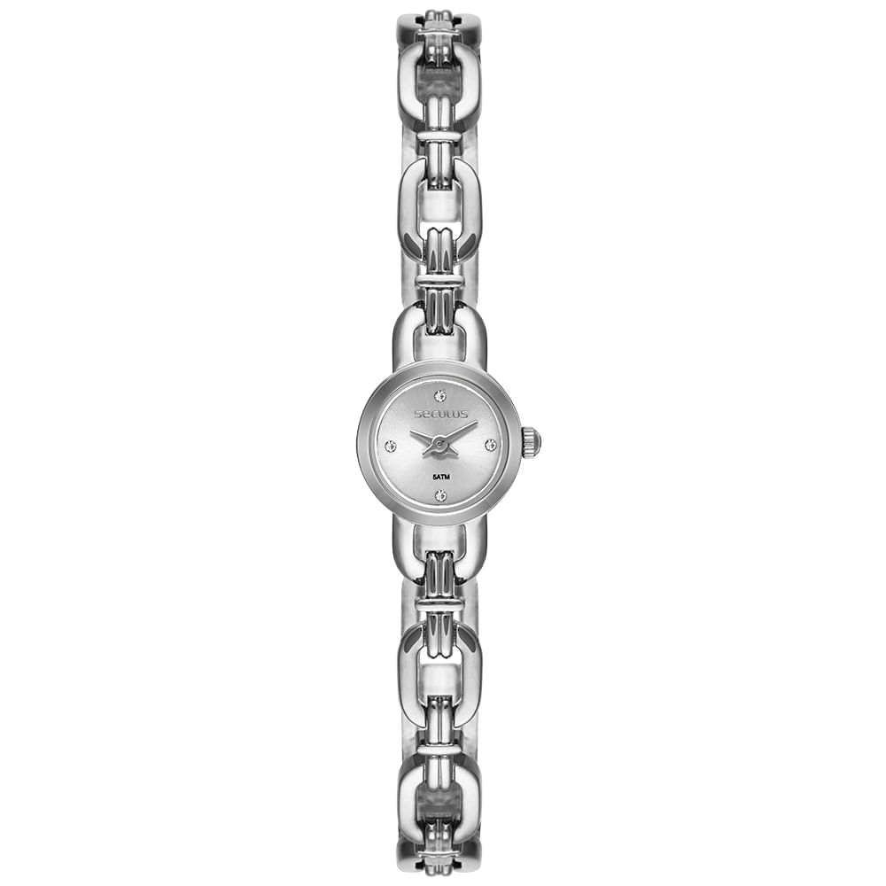 Este relógio feminino Seculus destaca-se pelo seu design delicado com uma caixa mini de apenas 15mm. O acabamento na cor prata confere brilho e versatilidade, ideal para compor diversos visuais. O mostrador é enriquecido com marcações em cristais, adicionando um toque de luz à peça.