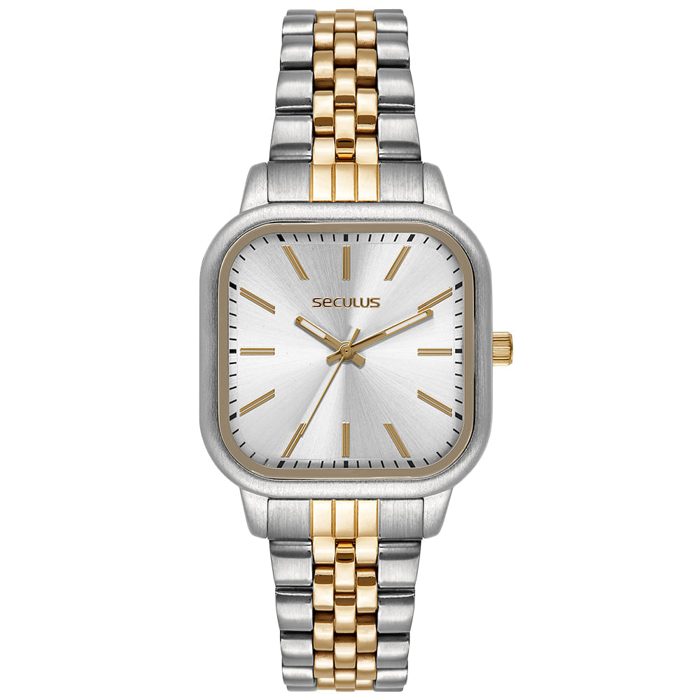 Relógio Seculus Feminino Prata com detalhes em Dourado combina elegância e design minimalista, confeccionada em aço inoxidável, proporcionando durabilidade e um visual clássico. Com formato quadrado, medindo 27 mm, construída em metal especial, conferindo resistência e elegância ao acessório. Estilo minimalista com index completo, facilitando a leitura das horas. Analógico, acionado lateralmente, garantindo precisão e facilidade de uso. Este modelo é perfeito para quem aprecia acessórios com design refinado e funcionalidade, sendo uma excelente opção para uso diário ou ocasiões especiais.