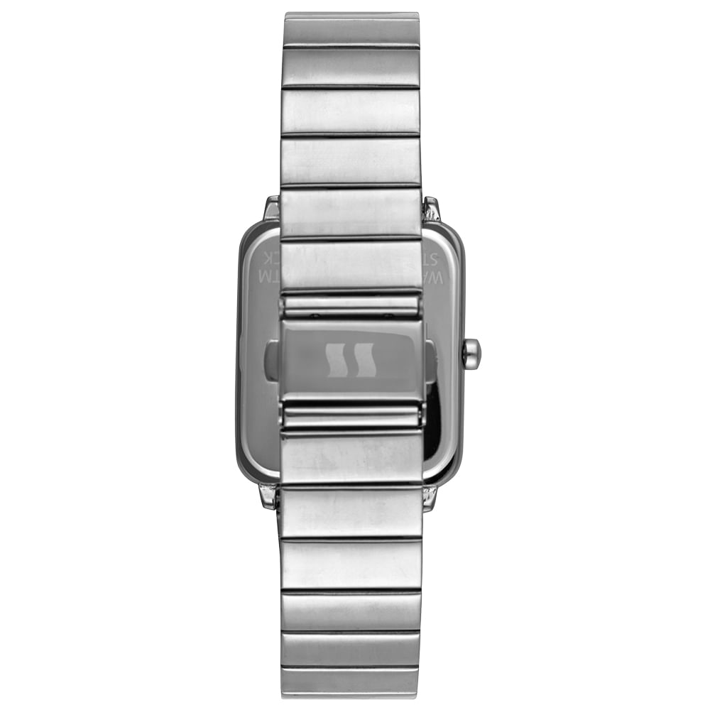 O Relógio Feminino da Seculus apresenta um design moderno e arrojado, com uma caixa de perfil quadrado de 32mm. O grande destaque é o seu mostrador prata de 29mm, que possui um efeito espelhado em toda a sua extensão, criando um visual impactante e contemporâneo. A caixa é feita de metal especial e a pulseira de aço diferenciada complementa o estilo único da peça.