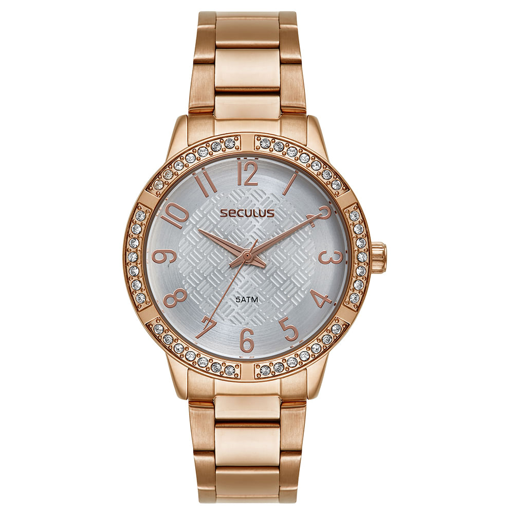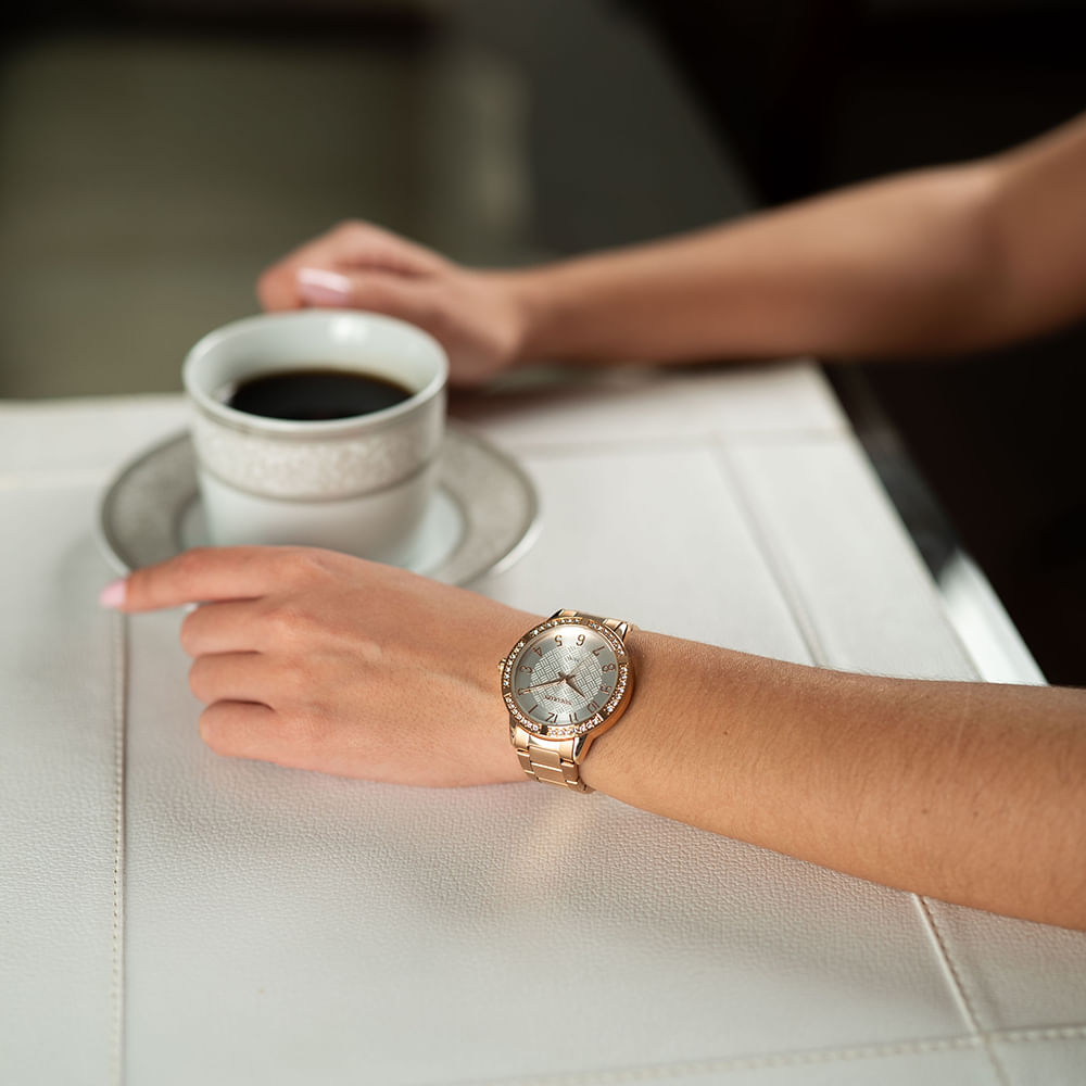 O mostrador prata com textura harmoniza perfeitamente com a pulseira rosé, enquanto a marcação em números e index oferece um toque clássico e elegante.