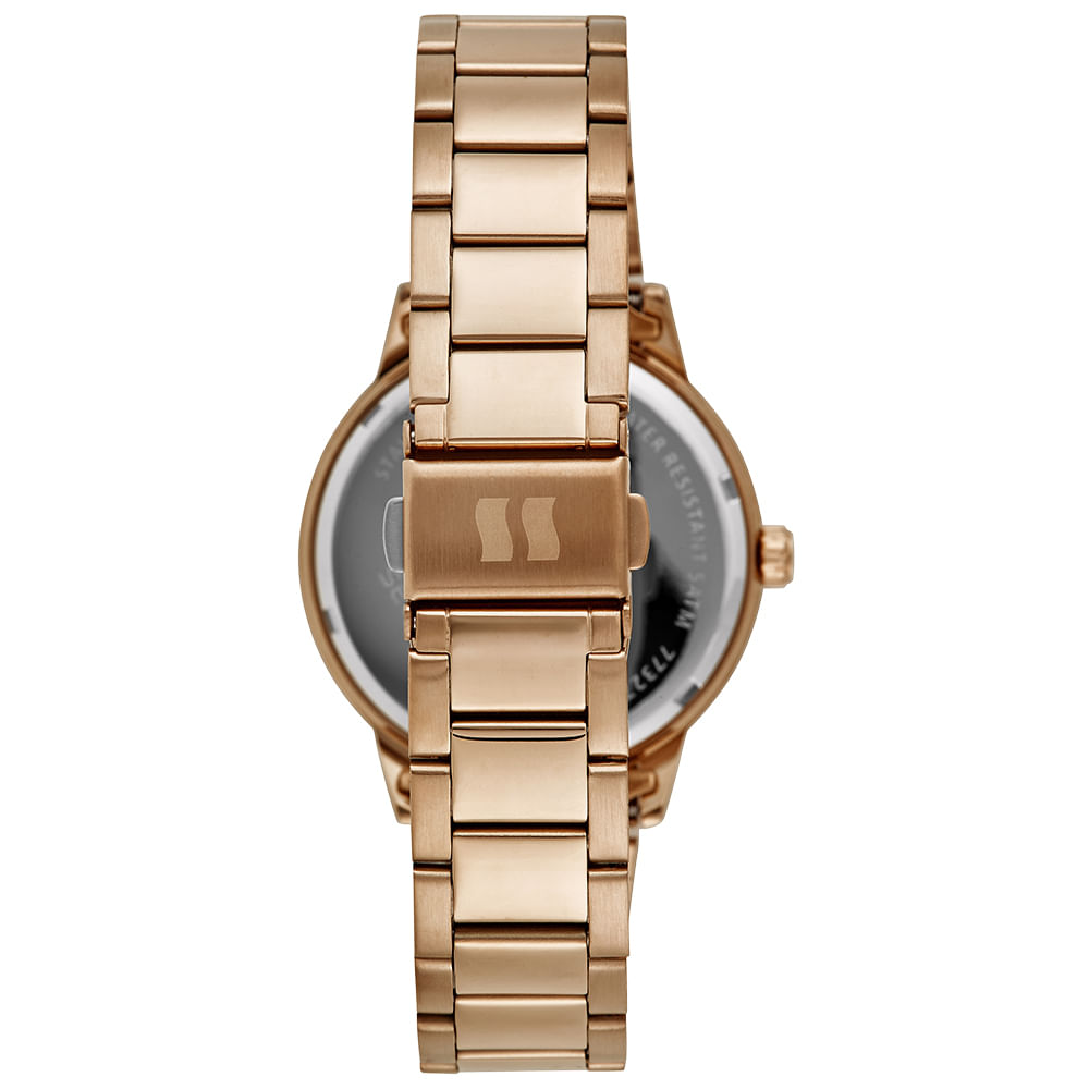 Este relógio conta com caixa de 38 mm em tom rosé e catraca com cristais cravejados, trazendo brilho e requinte à peça.