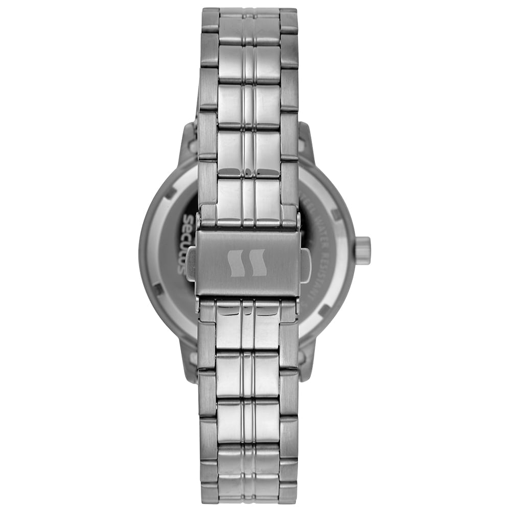 A caixa de 32mm em aço prata equilibra destaque e conforto, enquanto a estrutura fina transmite feminilidade.