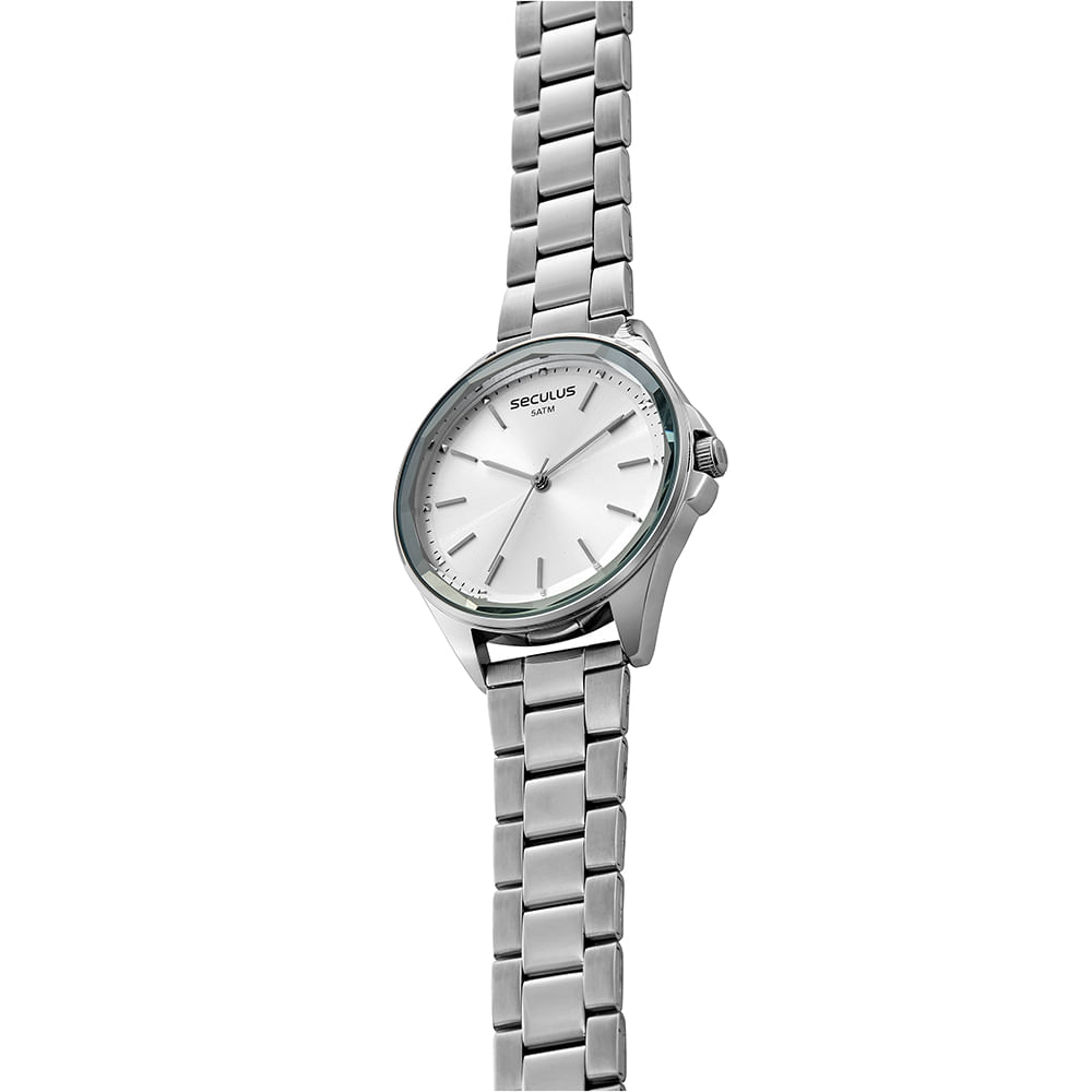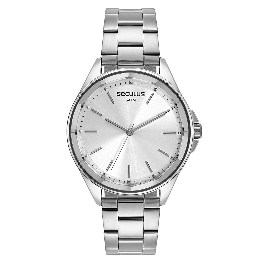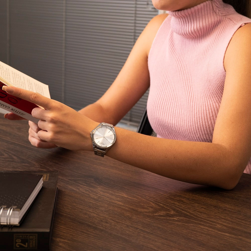 Relógio analógico com vidro facetado, minimalista e extremamente clássico, uma peça para todas as ocasiões. Tem folheação prata e pulseira em aço com fecho por acionamento lateral. É um modelo resistente e de longa durabilidade! Esse relógio possui a caixa em 4 de tamanho.
