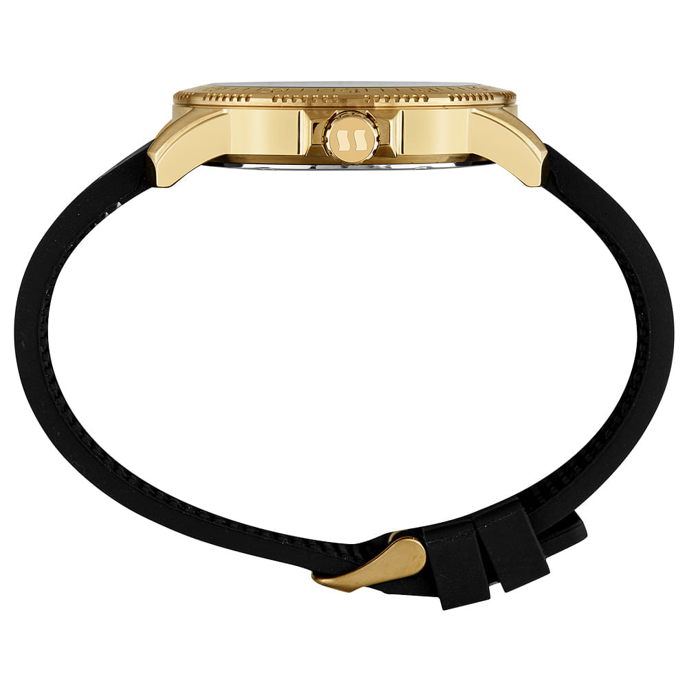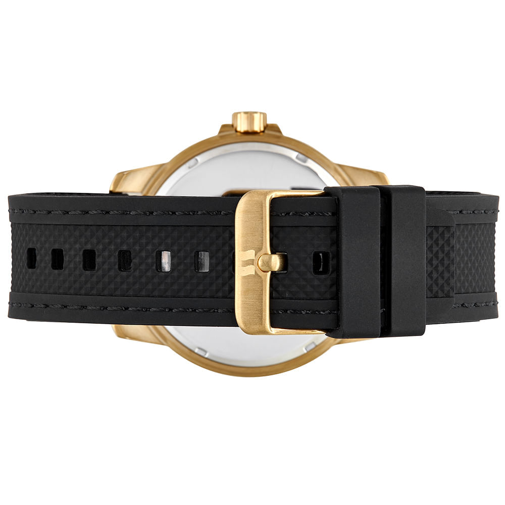 Este relógio analógico possui uma caixa em aço de 4,8 cm de diâmetro, adequada para todos os tamanhos de pulso. Destaca-se pela numeração completa no mostrador e pela pulseira em silicone com pespontos, que oferece conforto e estilo.
