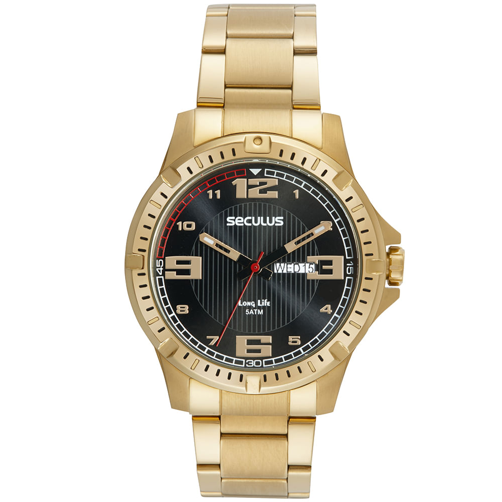 Todo em aço, um modelo perfeito para o dia a dia. É um relógio analógico com calendário, e que oferece um ótimo caimento a todos os tipos de pulsos. Combina a folheação dourada com o mostrador preto para deixar o visual bem moderno. Esse relógio possui a caixa em 4,6 cm de tamanho.