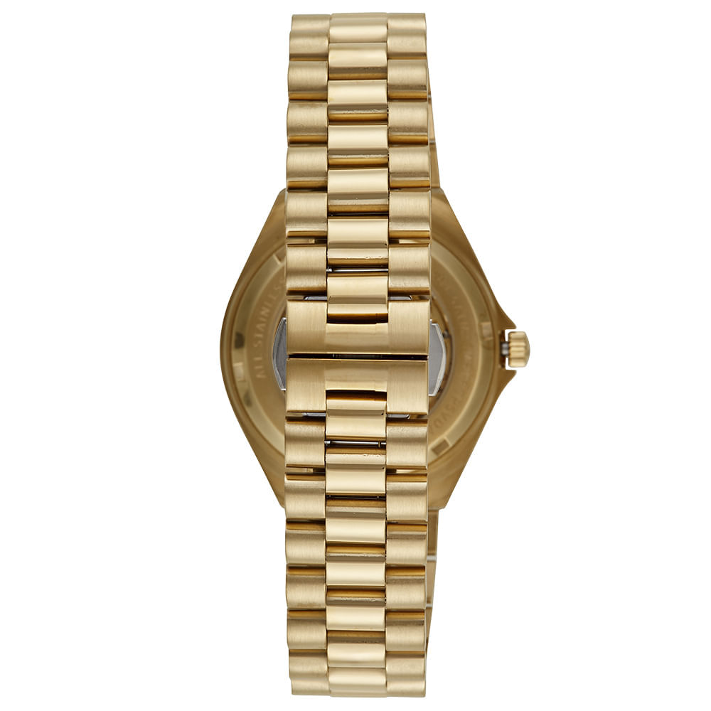 A pulseira sólida em aço Dourado com fecho borboleta com botões laterais garante ajuste seguro e confortável.