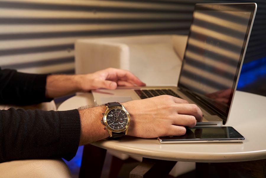 Caixa em aço. Catraca com marcações e mostrador 3d. Modelo cronógrafo com movimento com captação de energia solar. Este relógio contém visor preto e caixa de aço dourado com função cronógrafo. A pulseira trabalhada em silicone preto, possui fecho por fivela. Esse relógio possui a caixa em 4,8 cm de tamanho.