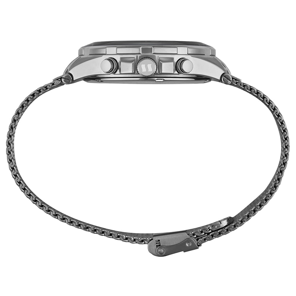 A pulseira é confeccionada em malha de aço, oferecendo um visual industrial e moderno que se integra perfeitamente à caixa diferenciada. O fechamento é do tipo joalheria, proporcionando segurança e um ajuste firme para o uso contínuo. Este modelo possui fundo rosqueado, o que amplia significativamente sua capacidade de vedação e proteção.