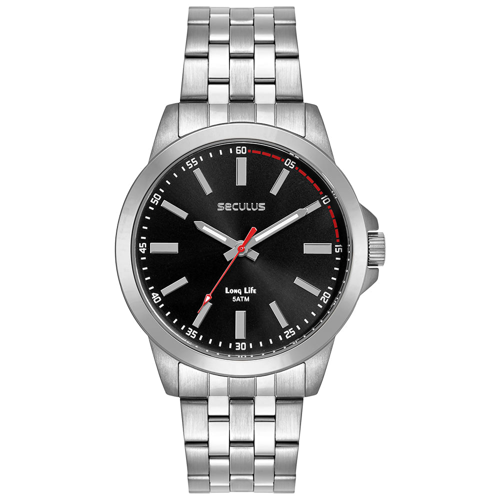 O Relógio representa o essencial com maestria, ideal para quem busca um acessório versátil e atemporal. Construído todo em aço inoxidável prateado, sua caixa de 44mm possui um design clássico que se adapta a qualquer ocasião. O mostrador preto, com marcadores de horas bem definidos, oferece um contraste elegante e uma leitura clara e objetiva. Focado na simplicidade e na função primordial de marcar as horas, este modelo sem calendário mantém um visual limpo e descomplicado. Com resistência à água de 5 ATM, é a escolha perfeita para o dia a dia, um relógio confiável que combina com tudo e nunca sai de moda.