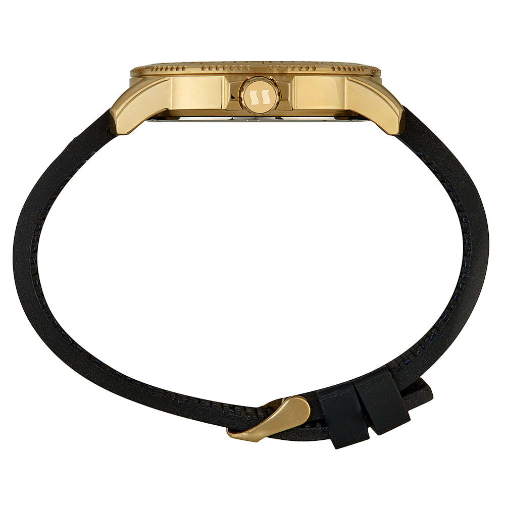 A marcação do mostrador utiliza números e indexes completos para ótima visibilidade. É um acessório imponente, perfeito para quem gosta de relógios maiores. A combinação do aço com o silicone e o mostrador preto cria uma peça funcional e cheia de estilo.